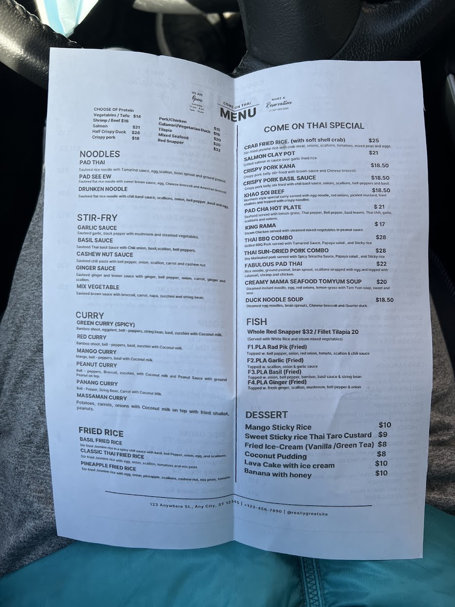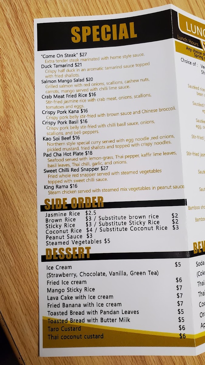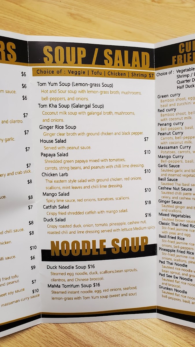 “ The food here is so good! My daughter and shared the Curry Puff and Crab Rangoon (best Crab Rangoon we’ve ever had!). I had the Pad Thai with Calamari, my daughter had the Massaman Curry, both were good sized portions. Every thing was excellent! ”