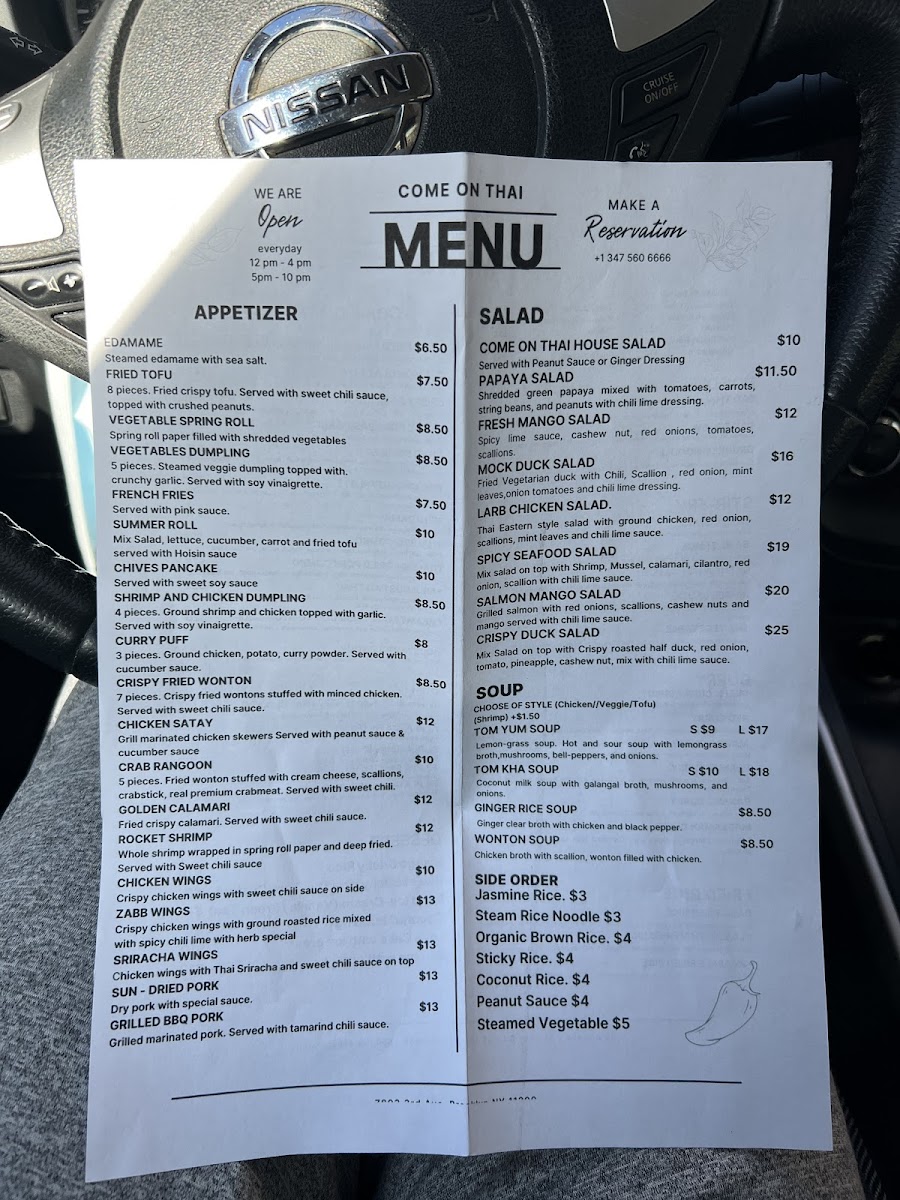 Welcome to Come On Thai Cuisine, a vibrant culinary gem nestled in the heart of Bay Ridge, Brooklyn, at 7803 3rd Ave, Brooklyn, NY 11209. This small yet inviting restaurant is not just a place to eat; it's an experience that delves deep into the rich, aromatic world of Thai cuisine. From the moment you step in, the enticing aromas captivate your senses, and the cozy decor sets the stage for an unforgettable dining experience.